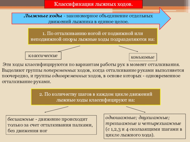 1. По отталкиванию ногой от подвижной или неподвижной опоры лыжные ходы подразделяются на: