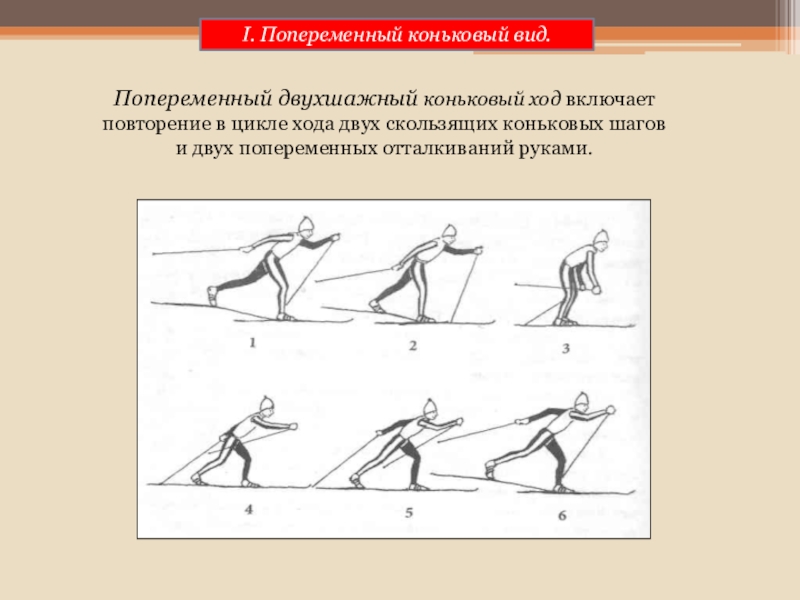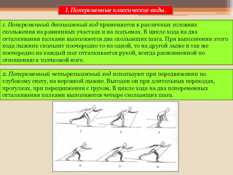 1. Попеременный двvхшажный ход применяется в различных условиях скольжения на равнинных участках и на подъемах. В цикле хода на два отталкивания палками выполняется два скользящих шага. При выполнении этого хода лыжник скользит поочередно то на одной, то на другой лыже и так же поочередно на каждый шаг отталкивается рукой, всегда разноименной по отношению к толчковой ноге.