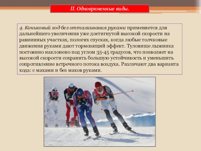 1. В одновременном бесшажном ходе происходит непрерывное скольжение на двух лыжах с отталкиванием только руками.