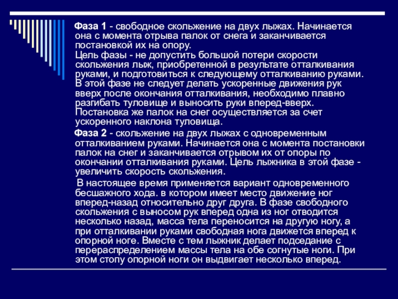 Слайд 9 Фаза 1 - свободное скольжение на двух лыжах. Начинается