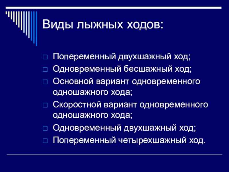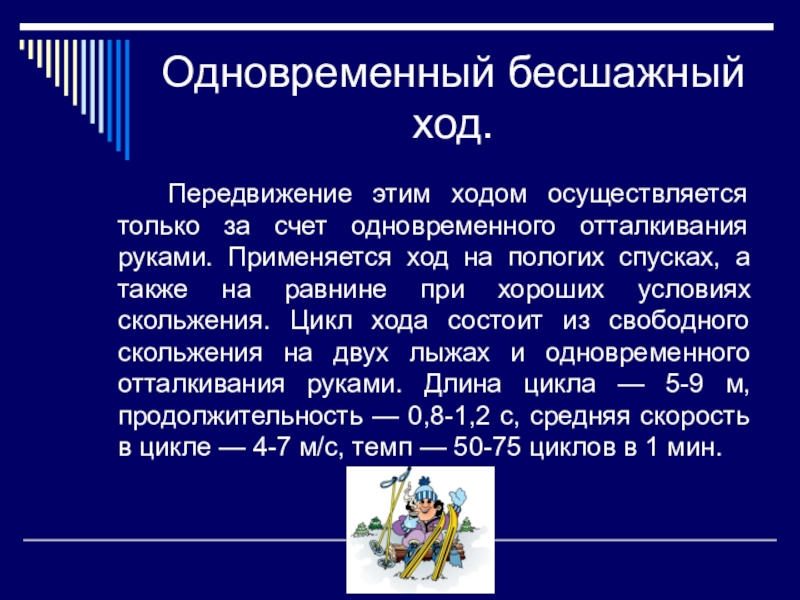 руками. Применяется ход на пологих спусках, а также на равнине при хороших условиях скольжения. Цикл хода состоит из свободного скольжения на двух лыжах и одновременного отталкивания руками. Длина цикла — 5-9 м, продолжительность — 0,8-1,2 с, средняя скорость в цикле — 4-7 м/с, темп — 50-75 циклов в 1 мин.