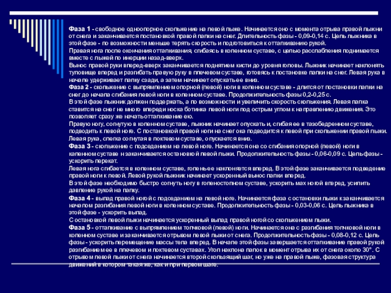 Фаза 5 - свободное одноопорное скольжение на левой лыже. Начинается фаза с отрыва правой лыжи от снега и заканчивается постановкой палок на опору. Продолжительность фазы 0,2-0,3 с.
