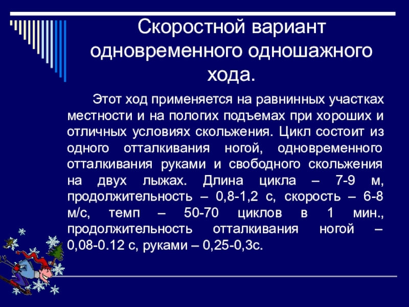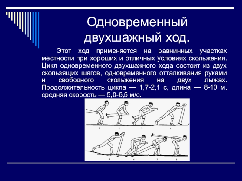 и отличных условиях скольжения. Цикл одновременного двухшажного хода состоит из двух скользящих шагов, одновременного отталкивания руками и свободного скольжения на двух лыжах. Продолжительность цикла — 1,7-2,1 с, длина — 8-10 м, средняя скорость — 5,0-6,5 м/с.
