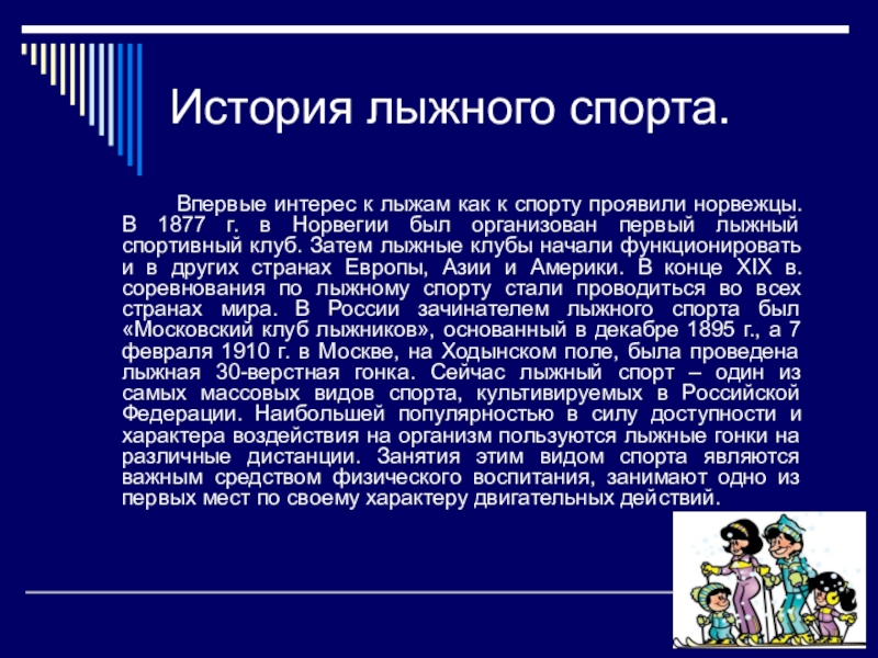 В 1877 г. в Норвегии был организован первый лыжный спортивный клуб. Затем лыжные клубы начали функционировать и в других странах Европы, Азии и Америки. В конце XIX в. соревнования по лыжному спорту стали проводиться во всех странах мира. В России зачинателем лыжного спорта был «Московский клуб лыжников», основанный в декабре 1895 г., а 7 февраля 1910 г. в Москве, на Ходынском поле, была проведена лыжная 30-верстная гонка. Сейчас лыжный спорт – один из самых массовых видов спорта, культивируемых в Российской Федерации. Наибольшей популярностью в силу доступности и характера воздействия на организм пользуются лыжные гонки на различные дистанции. Занятия этим видом спорта являются важным средством физического воспитания, занимают одно из первых мест по своему характеру двигательных действий.