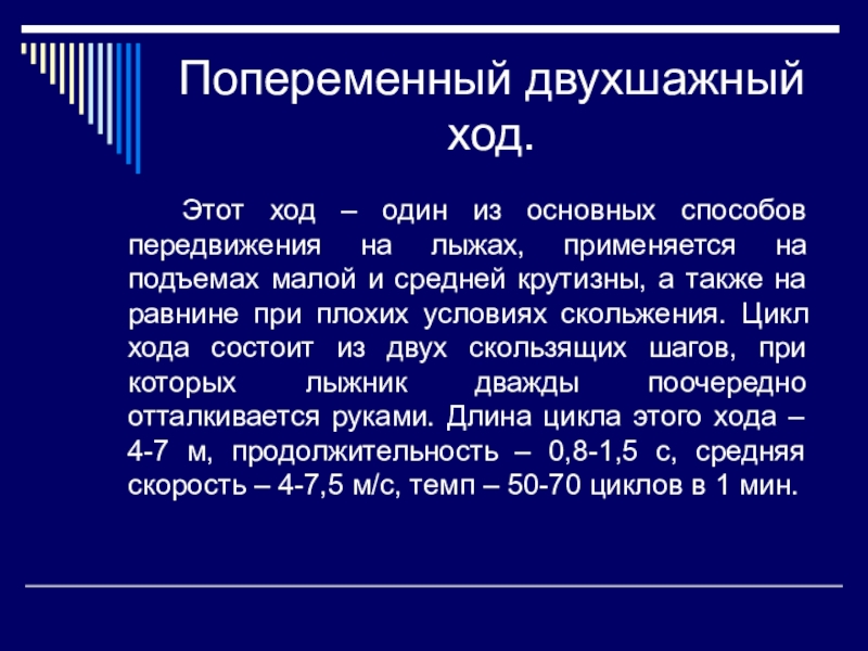лыжах, применяется на подъемах малой и средней крутизны, а также на равнине при плохих условиях скольжения. Цикл хода состоит из двух скользящих шагов, при которых лыжник дважды поочередно отталкивается руками. Длина цикла этого хода – 4-7 м, продолжительность – 0,8-1,5 с, средняя скорость – 4-7,5 м/с, темп – 50-70 циклов в 1 мин.
