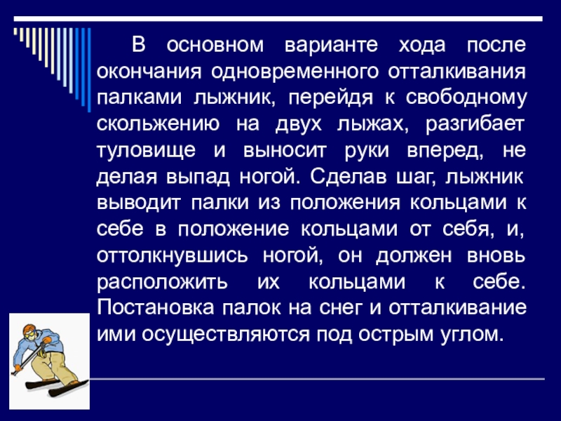 Слайд 11 В основном варианте хода после окончания одновременного отталкивания палками лыжник, перейдя