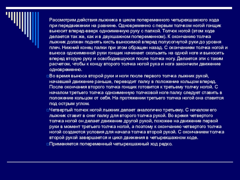 Слайд 18Рассмотрим действия лыжника в цикле попеременного четырехшажного хода при передвижении на