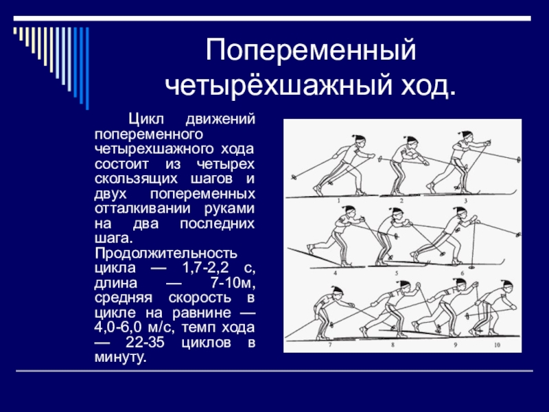 Цикл движений попеременного четырехшажного хода состоит из четырех скользящих