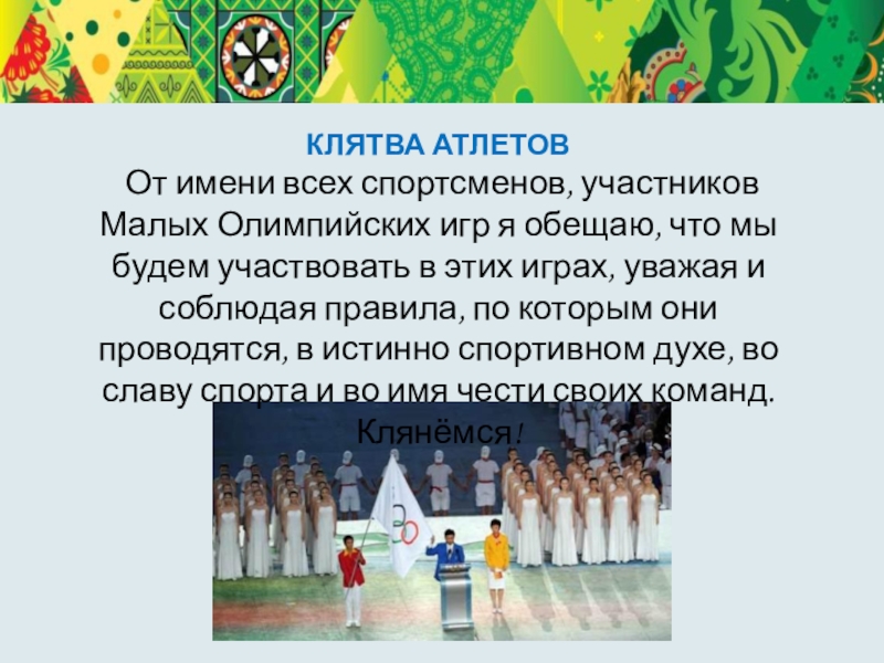 КЛЯТВА АТЛЕТОВ От имени всех спортсменов, участников Малых Олимпийских игр я обещаю, что мы будем участвовать в