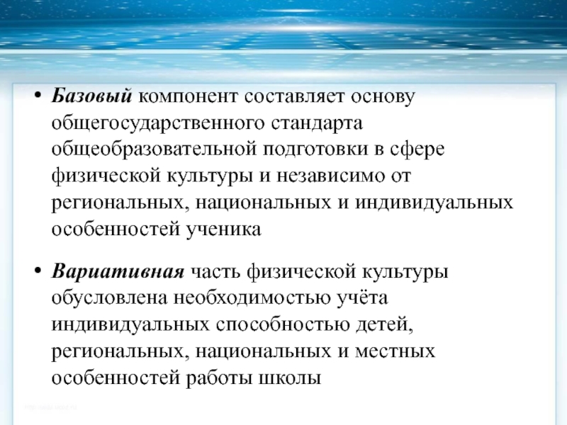 Слайд 5Базовый компонент составляет основу общегосударственного стандарта общеобразовательной подготовки в сфере физической