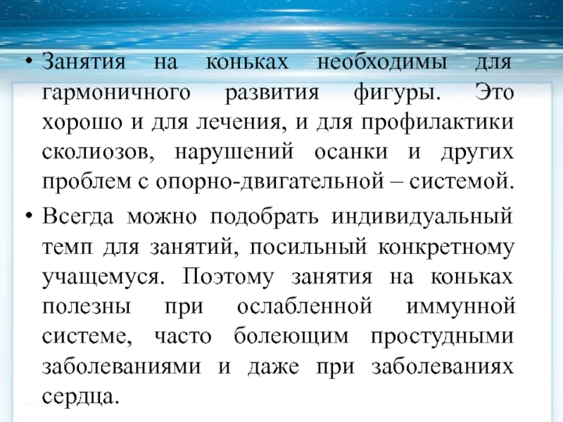 Всегда можно подобрать индивидуальный темп для занятий, посильный конкретному учащемуся. Поэтому занятия на коньках полезны при ослабленной иммунной системе, часто болеющим простудными заболеваниями и даже при заболеваниях сердца.