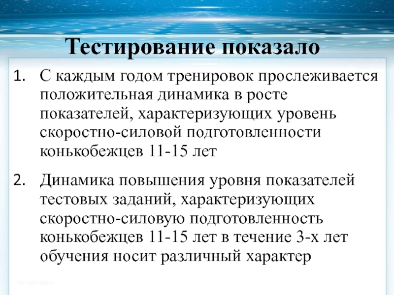 Слайд 19Динамика повышения уровня показателей тестов, характеризующих скоростно-силовую подготовленность конькобежцев