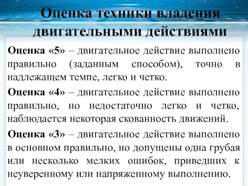 Слайд 13Оценка техники владения двигательными действиями