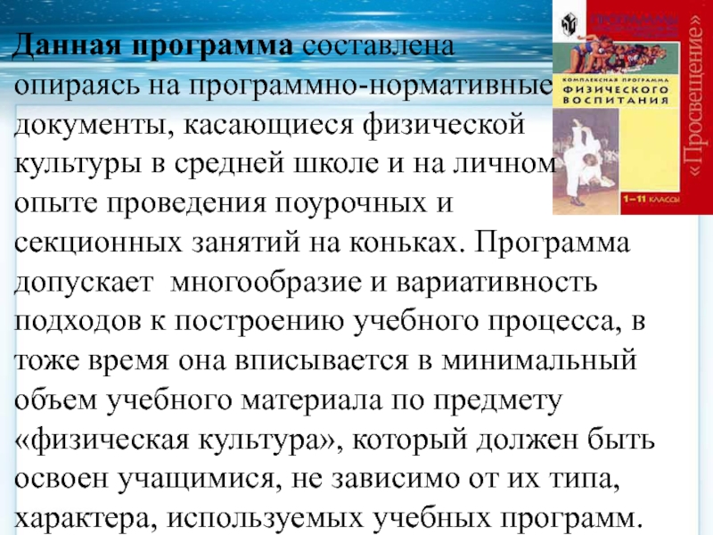секционных занятий на коньках. Программа допускает многообразие и вариативность подходов к построению учебного процесса, в тоже время она вписывается в минимальный объем учебного материала по предмету «физическая культура», который должен быть освоен учащимися, не зависимо от их типа, характера, используемых учебных программ.