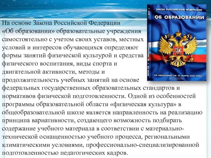 федеральных государственных образовательных стандартов и нормативов физической подготовленности. Одной из особенностей программы образовательной области «физическая культура» в общеобразовательной школе является направленность на реализацию принципа вариативности, создающего возможность подбирать содержание учебного материала в соответствии с материально-технической оснащенностью учебного процесса, региональными климатическими условиями, профессионально-специализированной подготовленностью педагогических кадров.