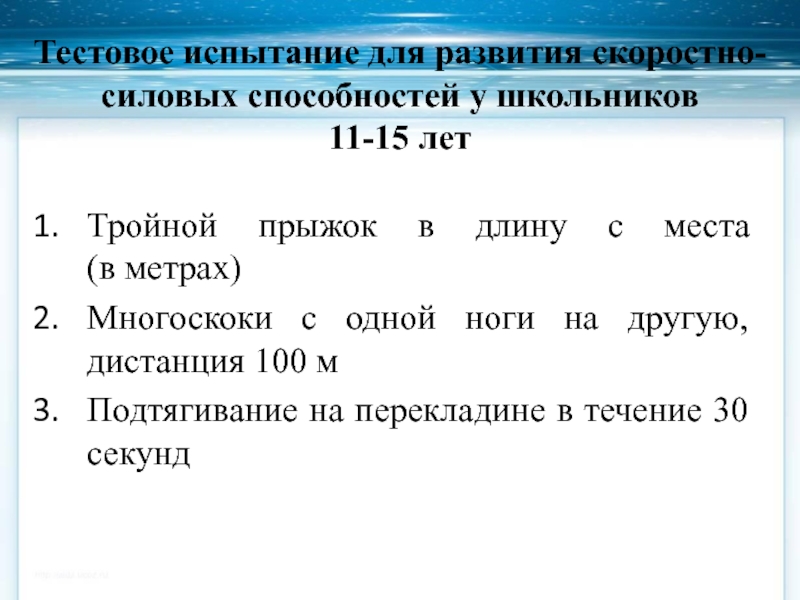 Слайд 18Тестовое испытание для развития скоростно-силовых способностей у школьников