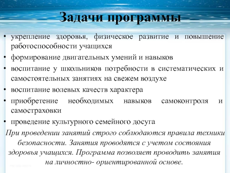 При проведении занятий строго соблюдаются правила техники безопасности. Занятия проводятся с учетом состояния здоровья учащихся. Программа позволяет проводить занятия на личностно- ориентированной основе.
