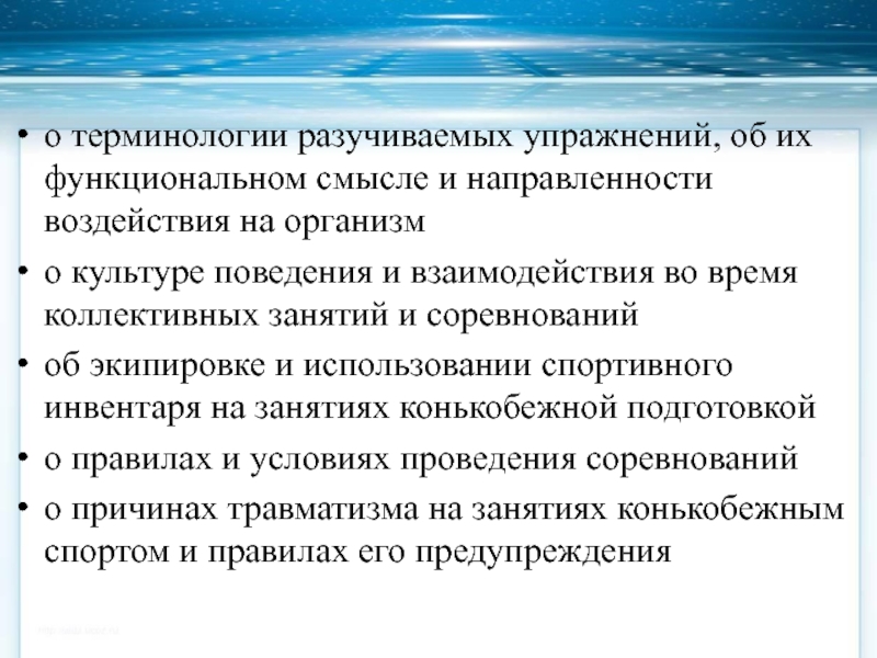 Слайд 15о терминологии разучиваемых упражнений, об их функциональном смысле и направленности воздействия