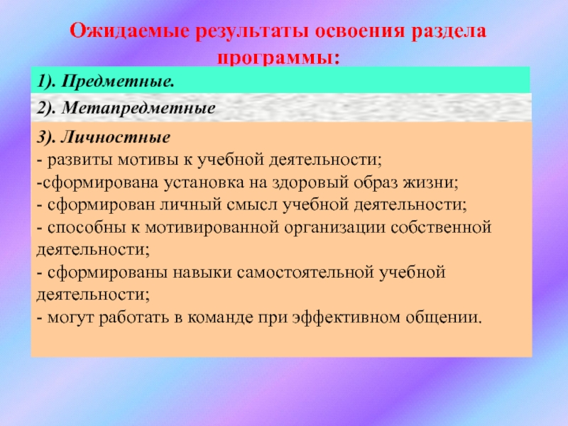 -приобретение компетентности в физкультурно-оздоровительной и спортивной деятельности и владение навыками творческого сотрудничества в коллективных формах занятий физическими упражнениями.