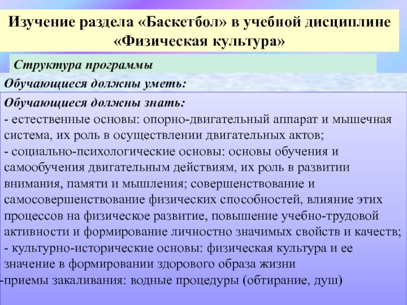- социально-психологические основы: основы обучения и самообучения двигательным действиям, их роль в развитии внимания, памяти и мышления; совершенствование и самосовершенствование физических способностей, влияние этих процессов на физическое развитие, повышение учебно-трудовой активности и формирование личностно значимых свойств и качеств;