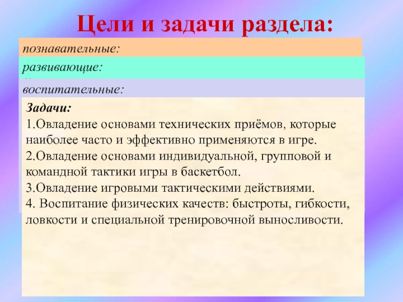 2.Овладение основами индивидуальной, групповой и командной тактики игры в баскетбол.