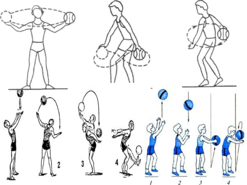 - подбрасывание мяча из-за спины через правое и левое плечо.