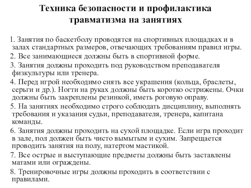 6. Занятия должны проходить на сухой площадке. Если игра проходит в зале, пол должен быть чисто вымытым и сухим. Запрещается проводить занятия на полу, натертом мастикой.