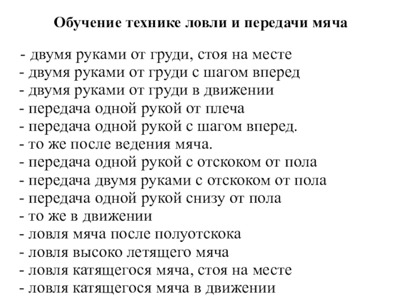 Слайд 14Обучение технике ловли и передачи мяча
