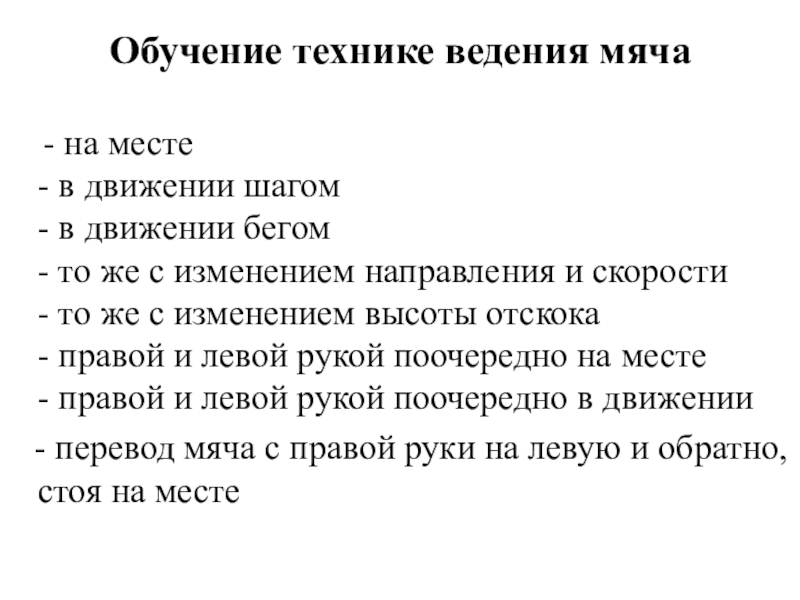 - перевод мяча с правой руки на левую и обратно, стоя на месте