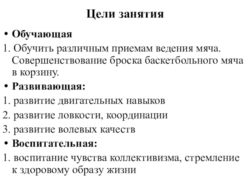 1. Обучить различным приемам ведения мяча. Совершенствование броска баскетбольного мяча