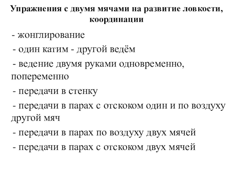 Слайд 11Упражнения с двумя мячами на развитие ловкости, координации