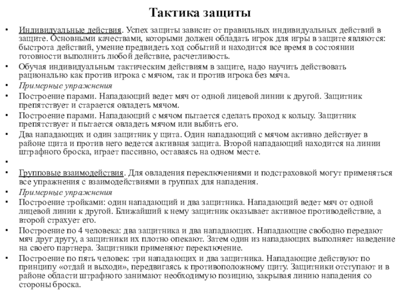 Обучая индивидуальным тактическим действиям в защите, надо научить действовать рационально как против игрока с мячом, так и против игрока без мяча.