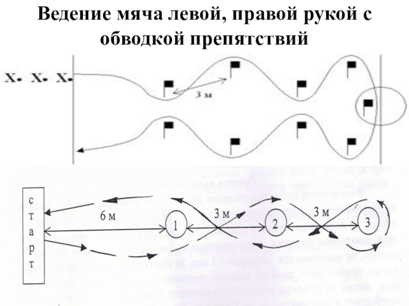 Слайд 26Ведение мяча левой, правой рукой с обводкой препятствий