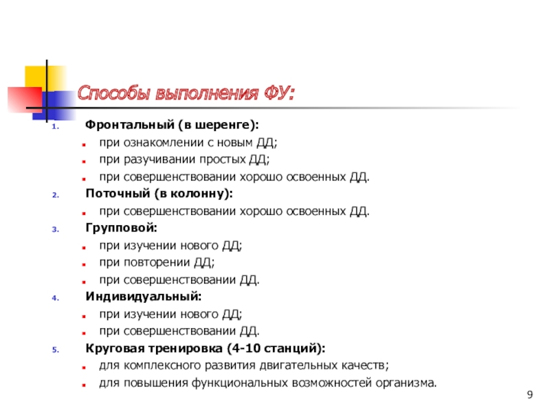 Способы выполнения ФУ:Фронтальный (в шеренге):при ознакомлении с новым ДД;при разучивании простых ДД;при совершенствовании хорошо освоенных ДД.Поточный (в