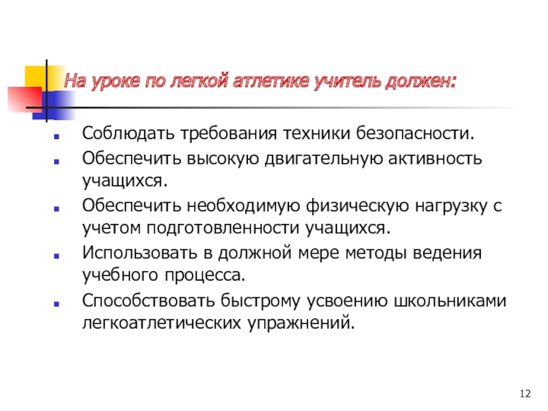Слайд 12На уроке по легкой атлетике учитель должен: