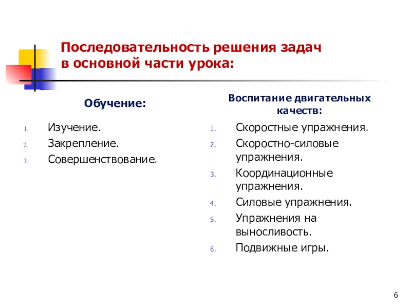 Последовательность решения задач в основной части урока:Обучение:Изучение.Закрепление.Совершенствование.Воспитание двигательных качеств:Скоростные упражнения.Скоростно-силовые упражнения.Координационные упражнения.Силовые упражнения.Упражнения на выносливость.Подвижные игры.