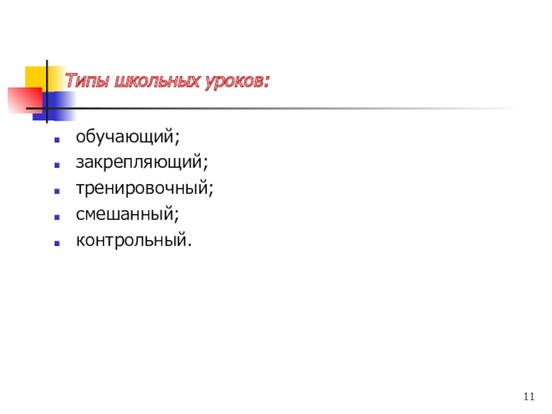 Типы школьных уроков:обучающий;закрепляющий;тренировочный;смешанный;контрольный.