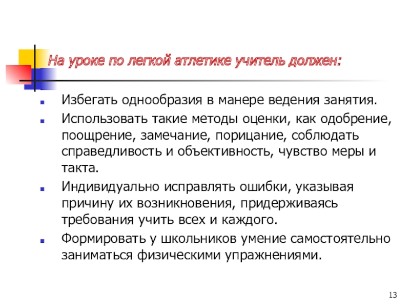 На уроке по легкой атлетике учитель должен:Избегать однообразия в манере ведения занятия.Использовать такие методы оценки, как одобрение,