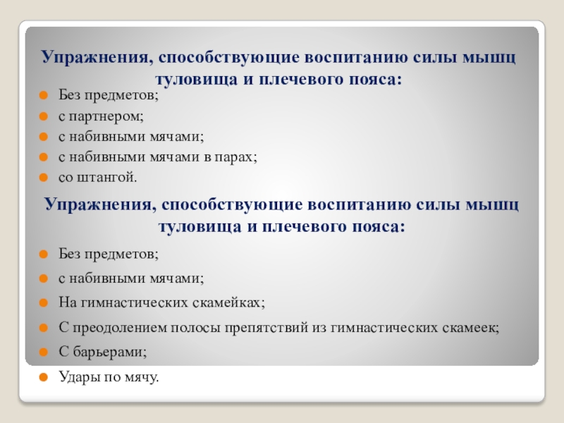 Упражнения, способствующие воспитанию силы мышц туловища и плечевого пояса: