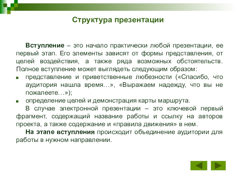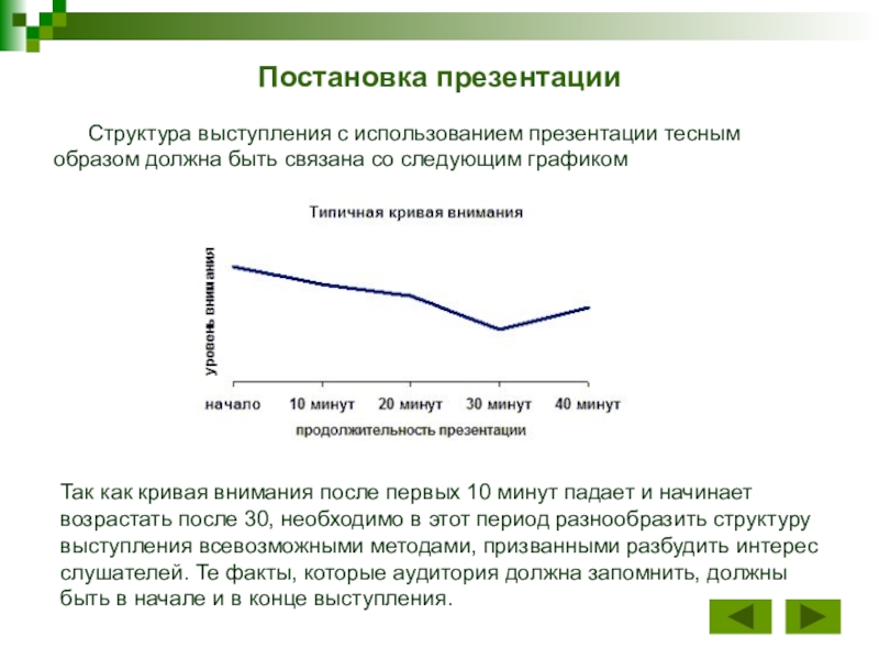 Так как кривая внимания после первых 10 минут падает и начинает возрастать после 30, необходимо в этот период разнообразить структуру выступления всевозможными методами, призванными разбудить интерес слушателей. Те факты, которые аудитория должна запомнить, должны быть в начале и в конце выступления.