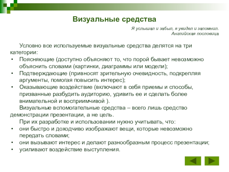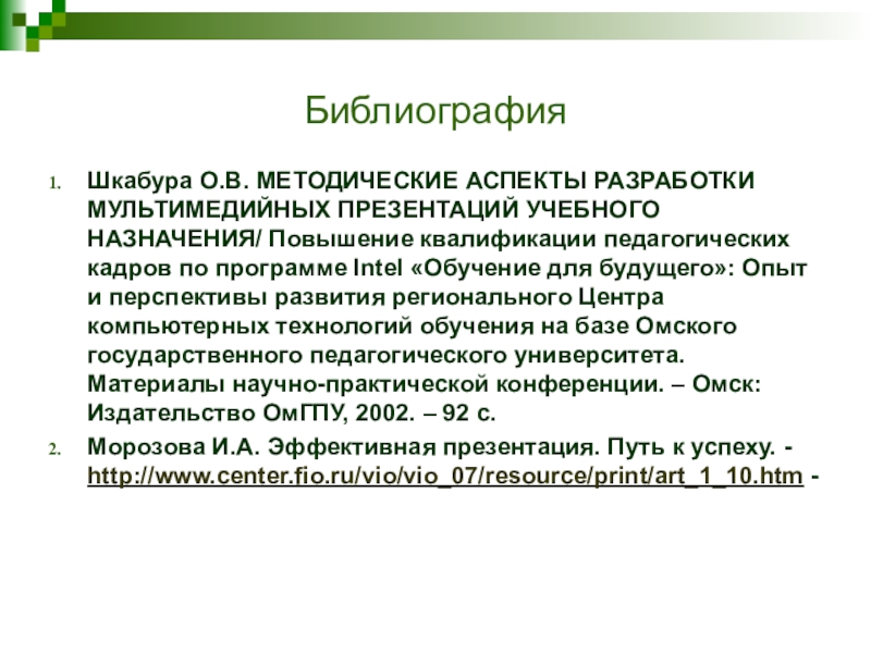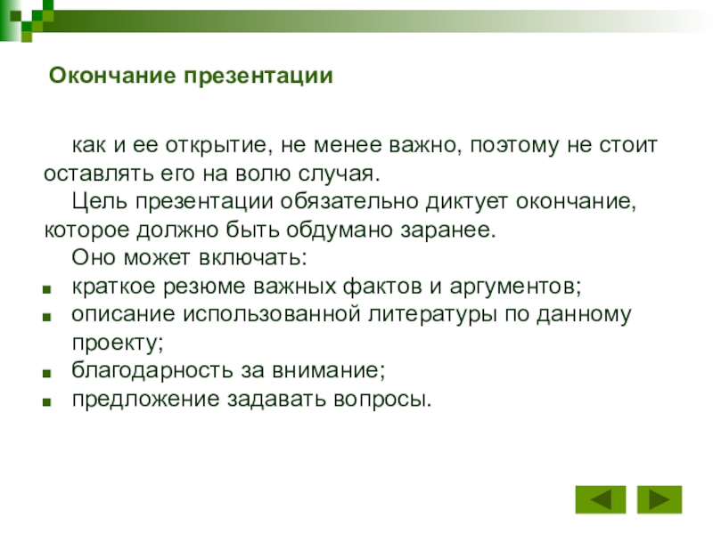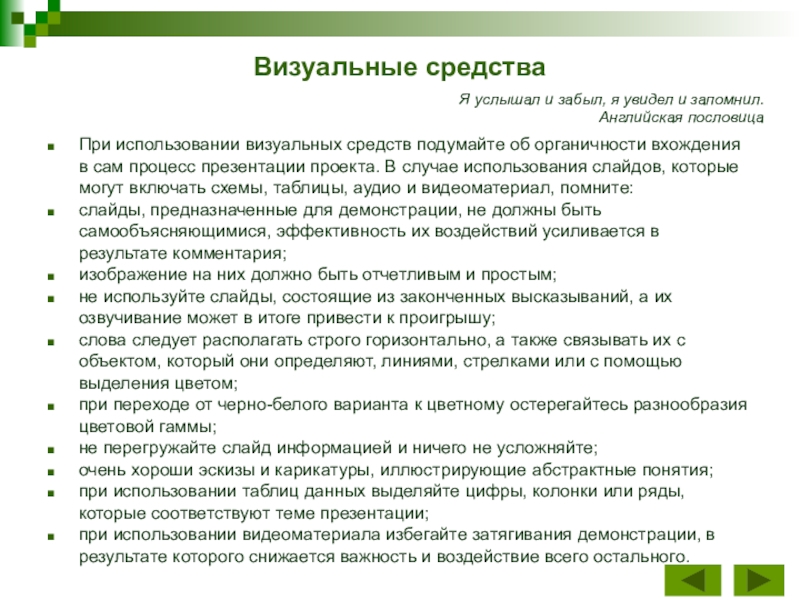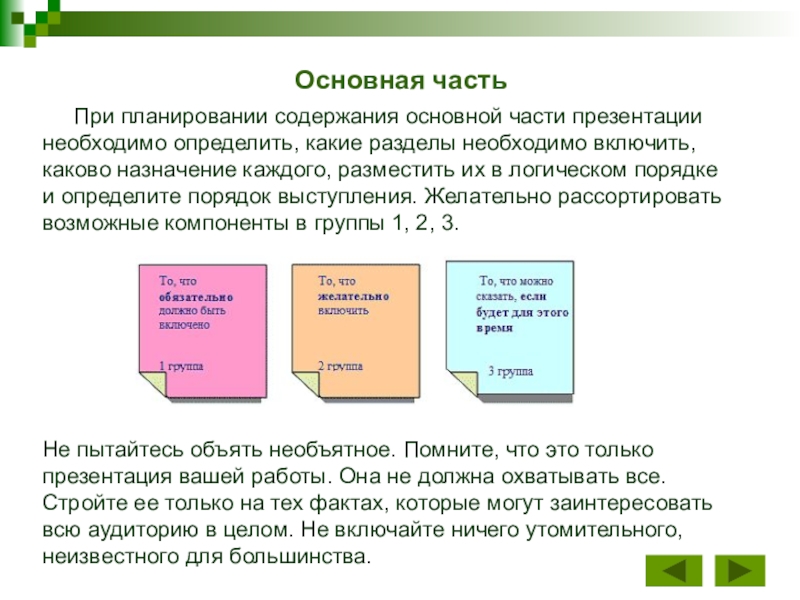 Не пытайтесь объять необъятное. Помните, что это только презентация вашей работы. Она не должна охватывать все. Стройте ее только на тех фактах, которые могут заинтересовать всю аудиторию в целом. Не включайте ничего утомительного, неизвестного для большинства.