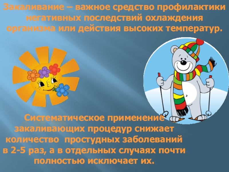 Систематическое применение закаливающих процедур снижает количество простудных заболеваний в 2-5 раз, а в отдельных случаях почти полностью исключает их.