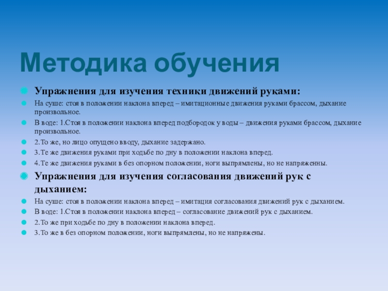 Слайд 12Упражнения для изучения согласования движений рук и ног при заданном дыхании: