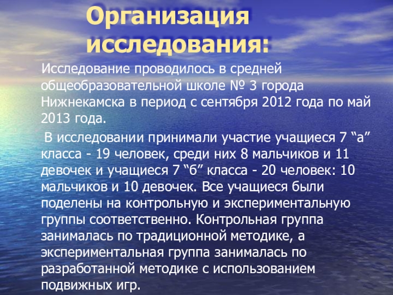 Организация исследования:   Исследование проводилось в средней общеобразовательной школе № 3 города Нижнекамска в период с