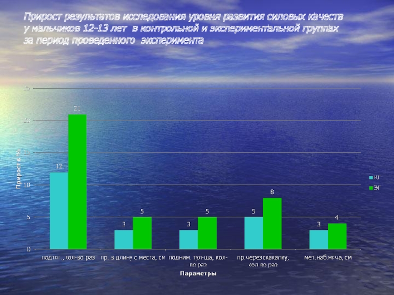Слайд 12Прирост результатов исследования уровня развития силовых качеств у мальчиков 12-13 лет