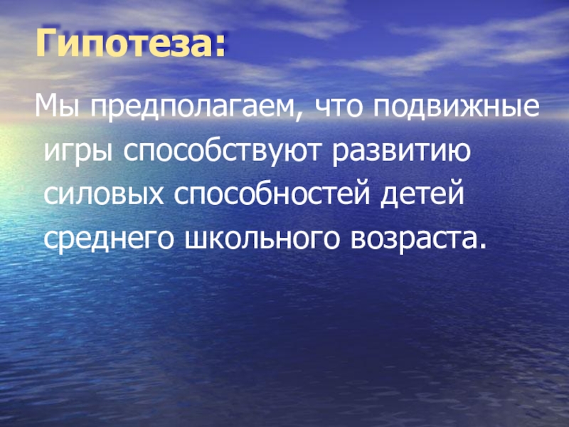 Гипотеза:	Мы предполагаем, что подвижные игры способствуют развитию силовых способностей детей среднего школьного возраста.