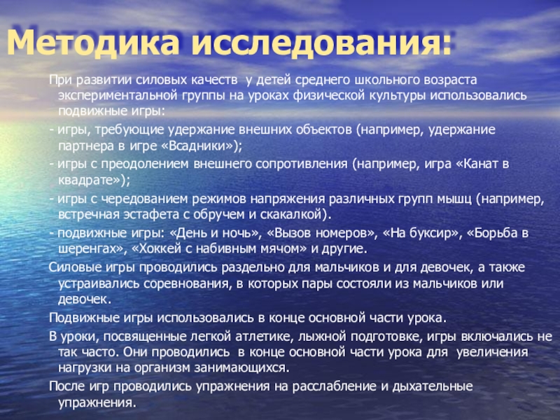Методика исследования:   	При развитии силовых качеств у детей среднего школьного возраста экспериментальной группы на уроках