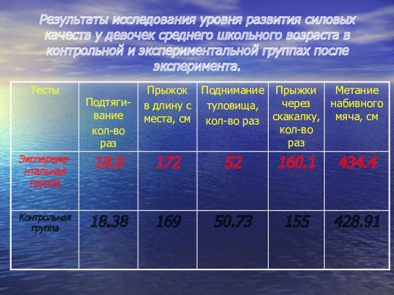 Слайд 11Результаты исследования уровня развития силовых качеств у девочек среднего школьного возраста