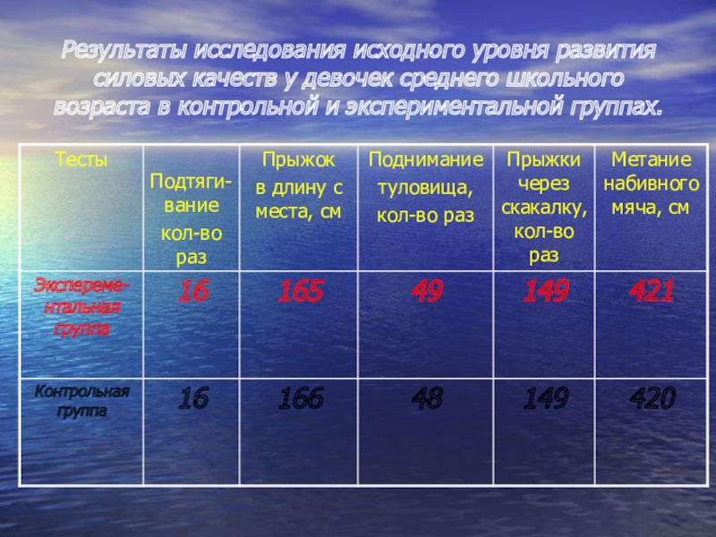 Слайд 9Результаты исследования исходного уровня развития силовых качеств у девочек среднего школьного