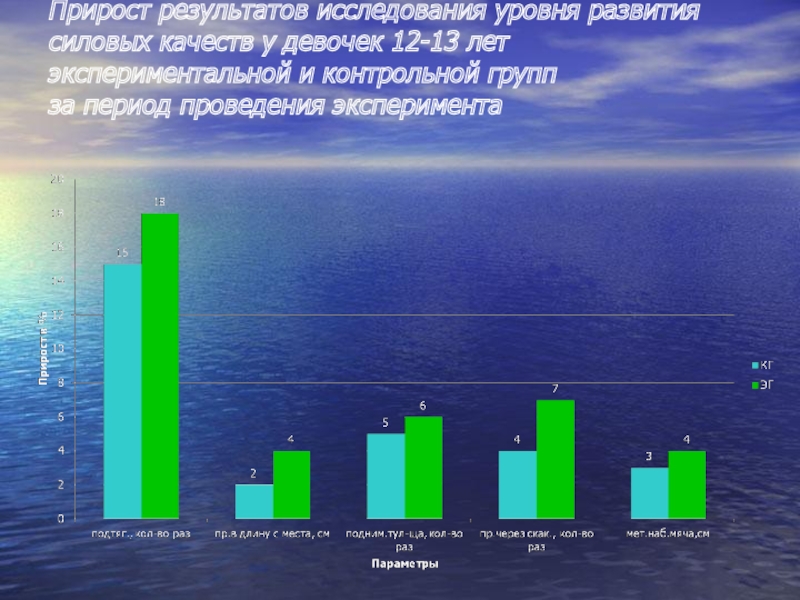 Слайд 13Прирост результатов исследования уровня развития силовых качеств у девочек 12-13 лет